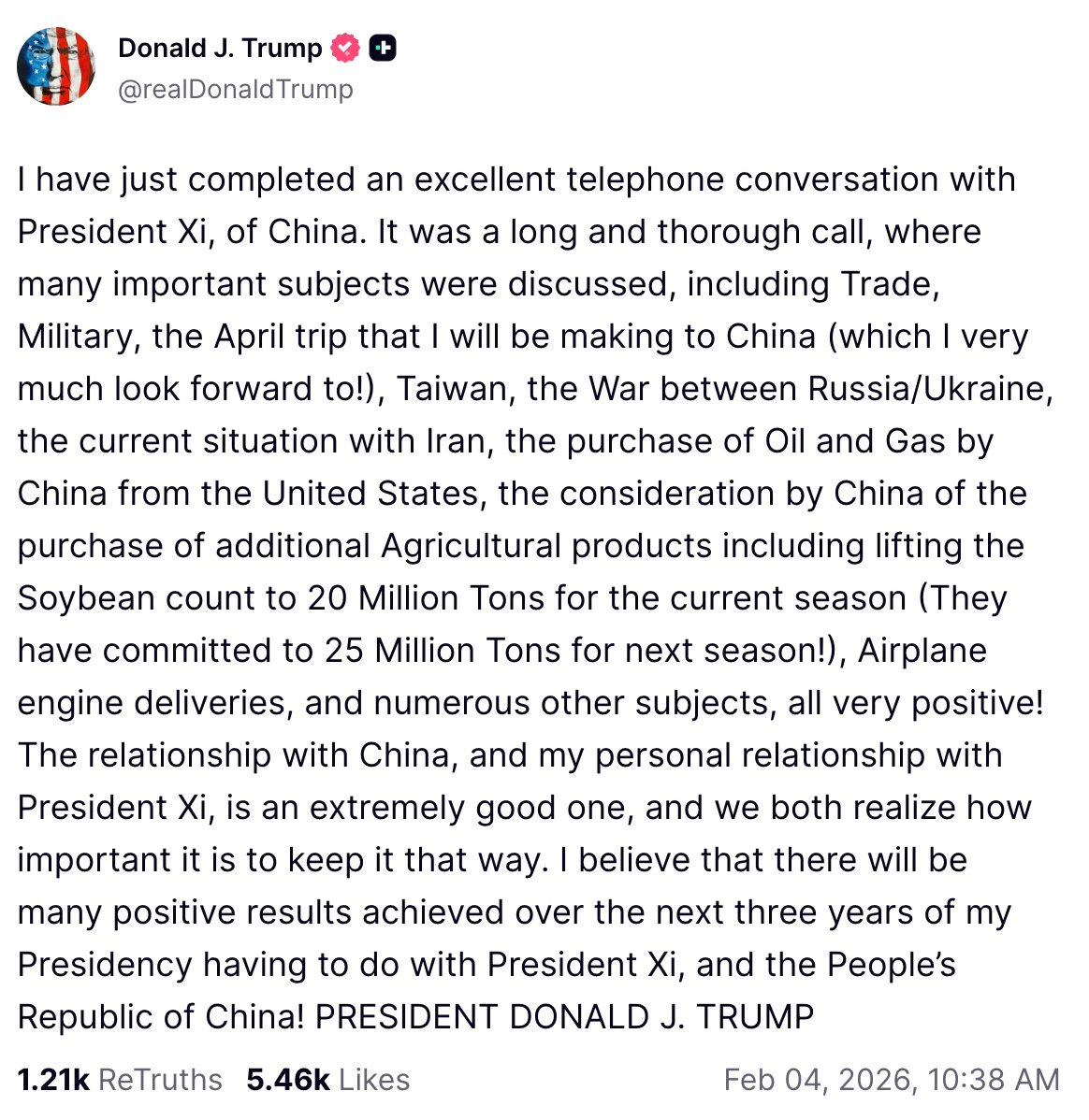 The official Xinhua report on Xi-Trump call (in Chinese only): http://politics.people.com.cn/BIG5/n1/2026/0204/c1024-40659623.html